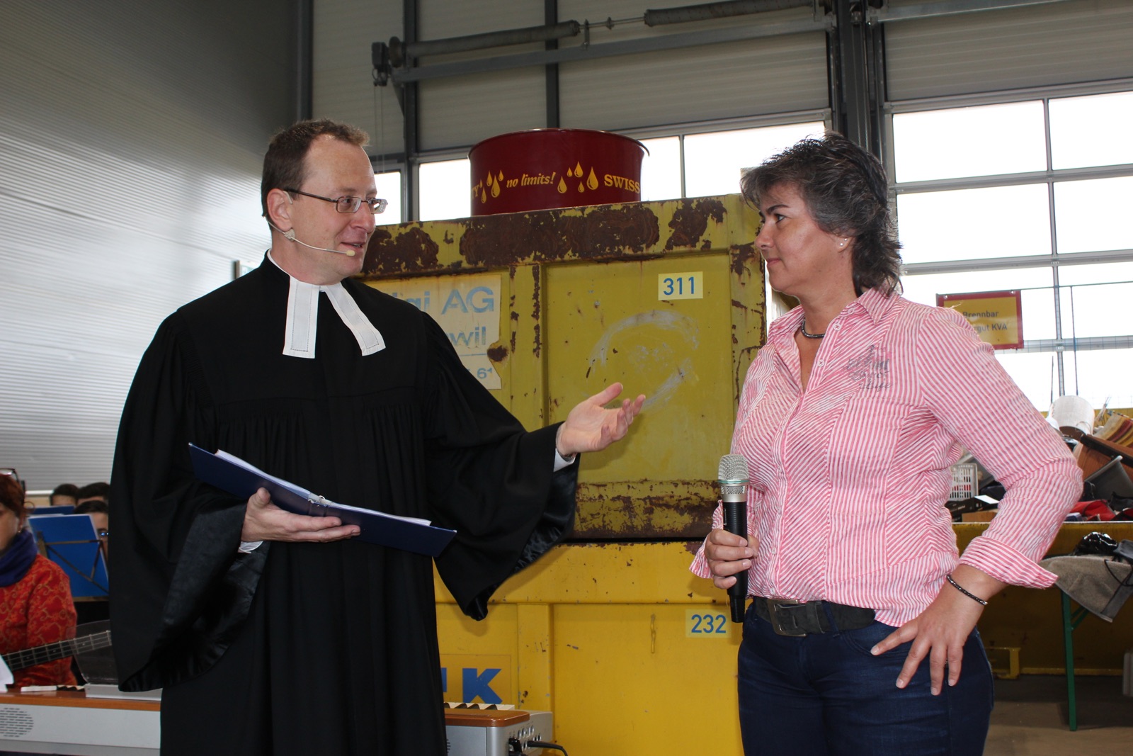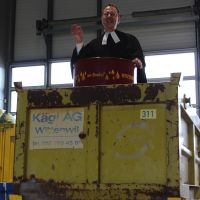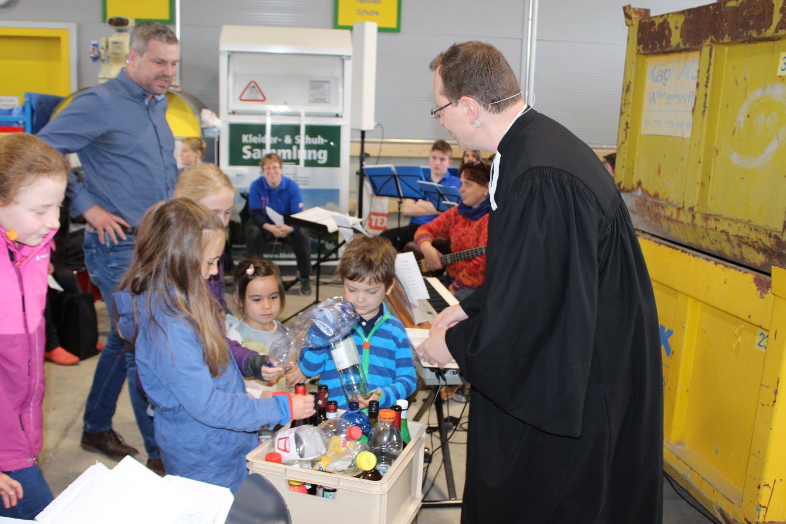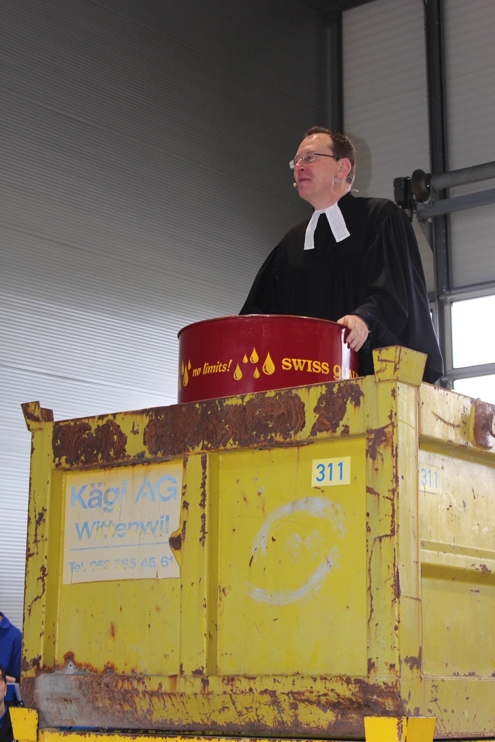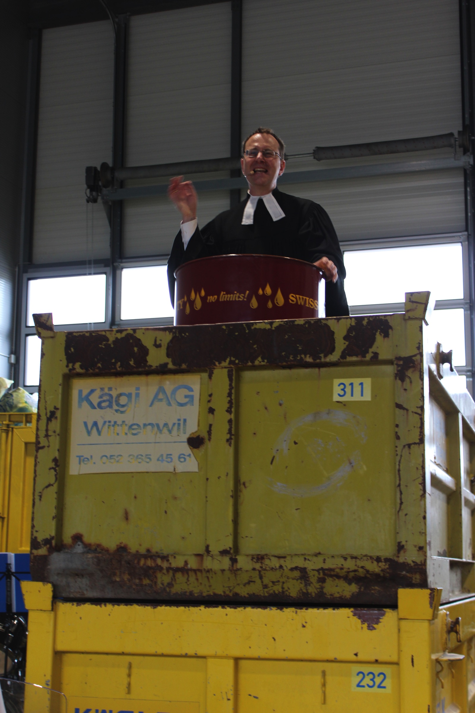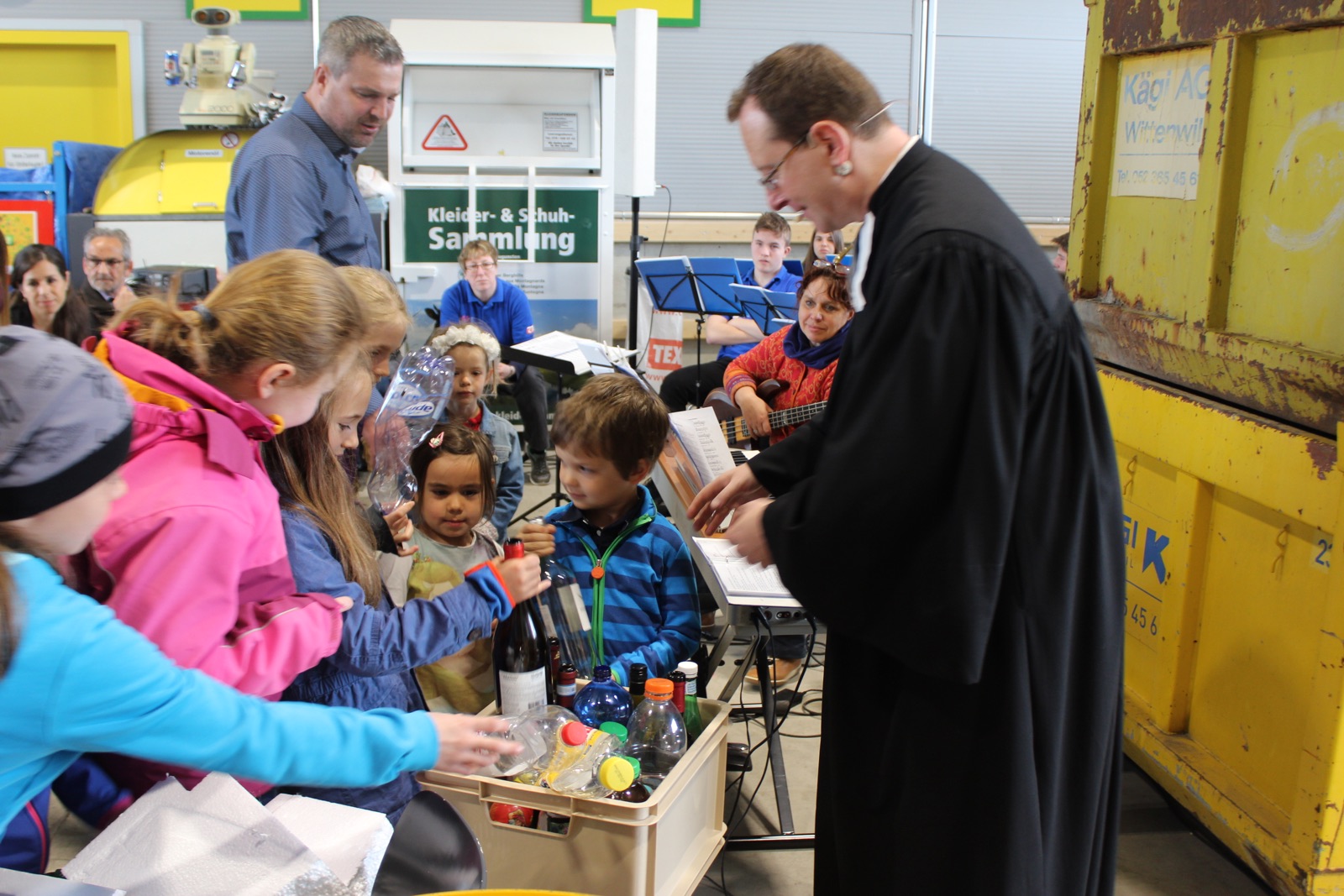 Die evangelische Kirche Aadorf tauschte für einmal ihre gewohnte Umgebung mit dem Sammelhof in Aadorf der Firma Kägi. Sie feierten den Sonntagsgottesdienst zwischen Pet-Flaschen, Aluminiumdosen und leeren Batterien.