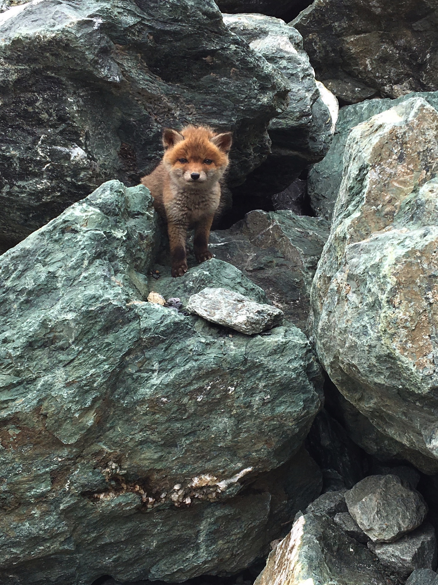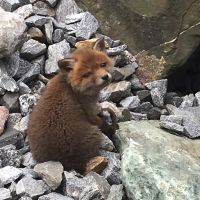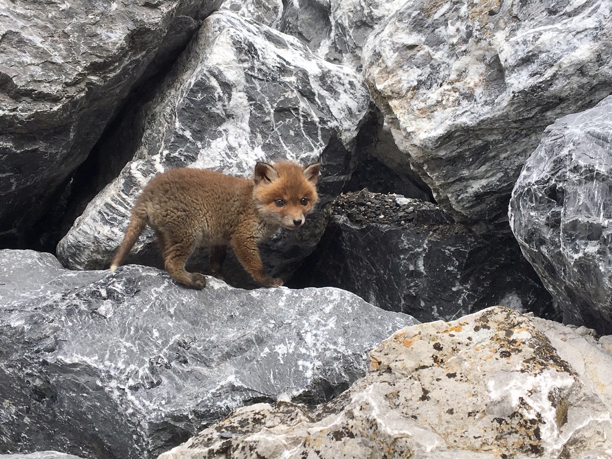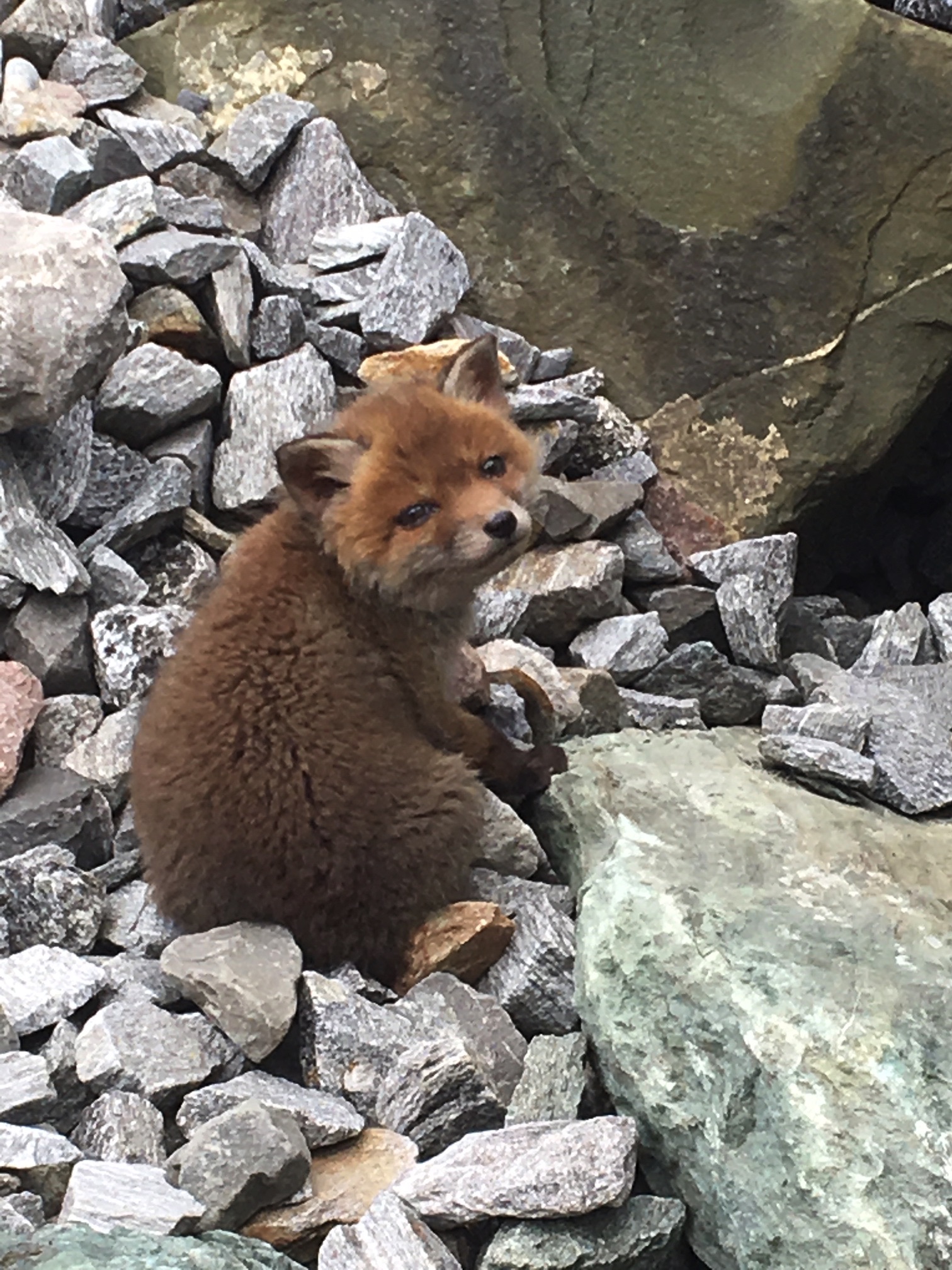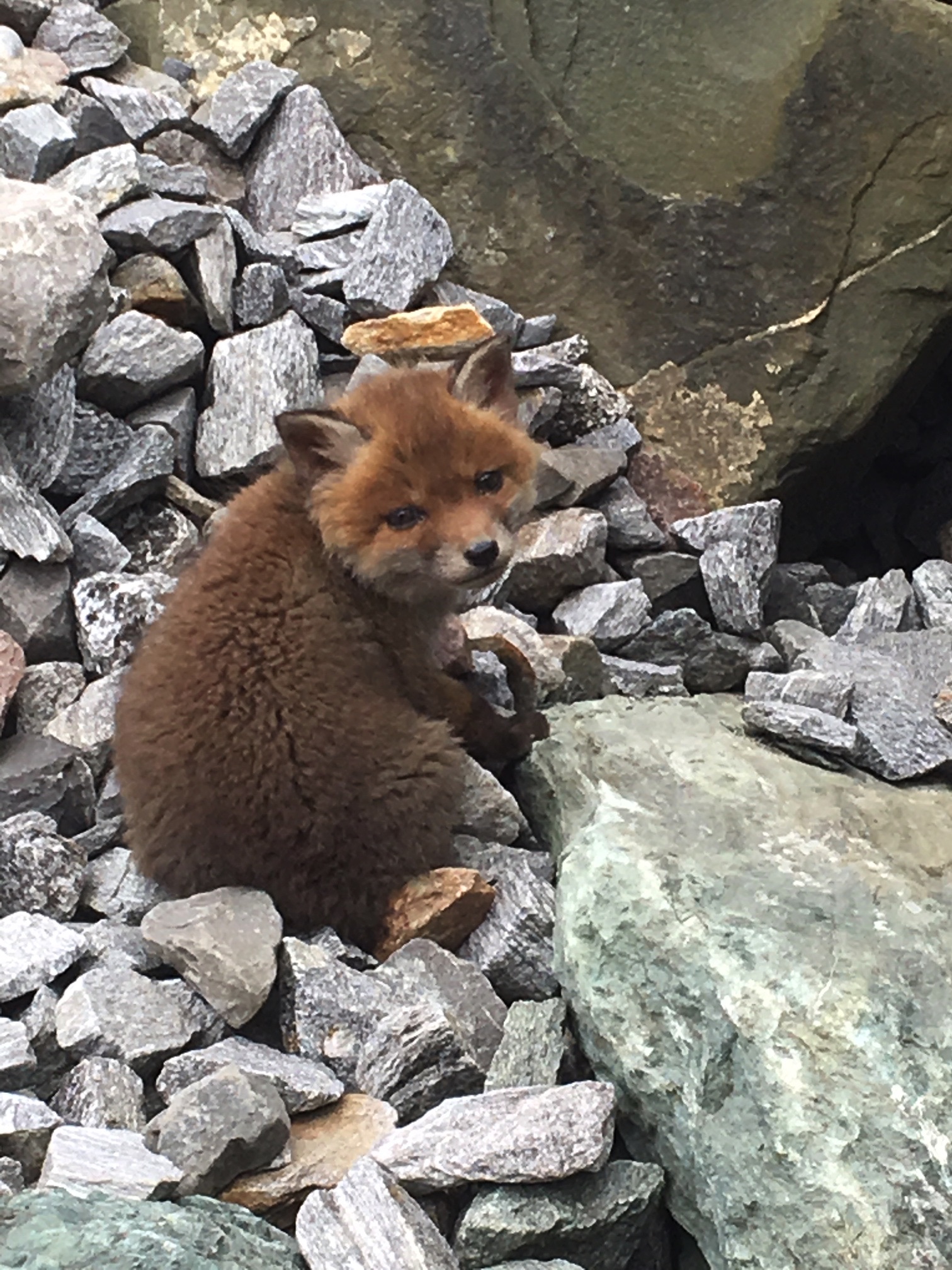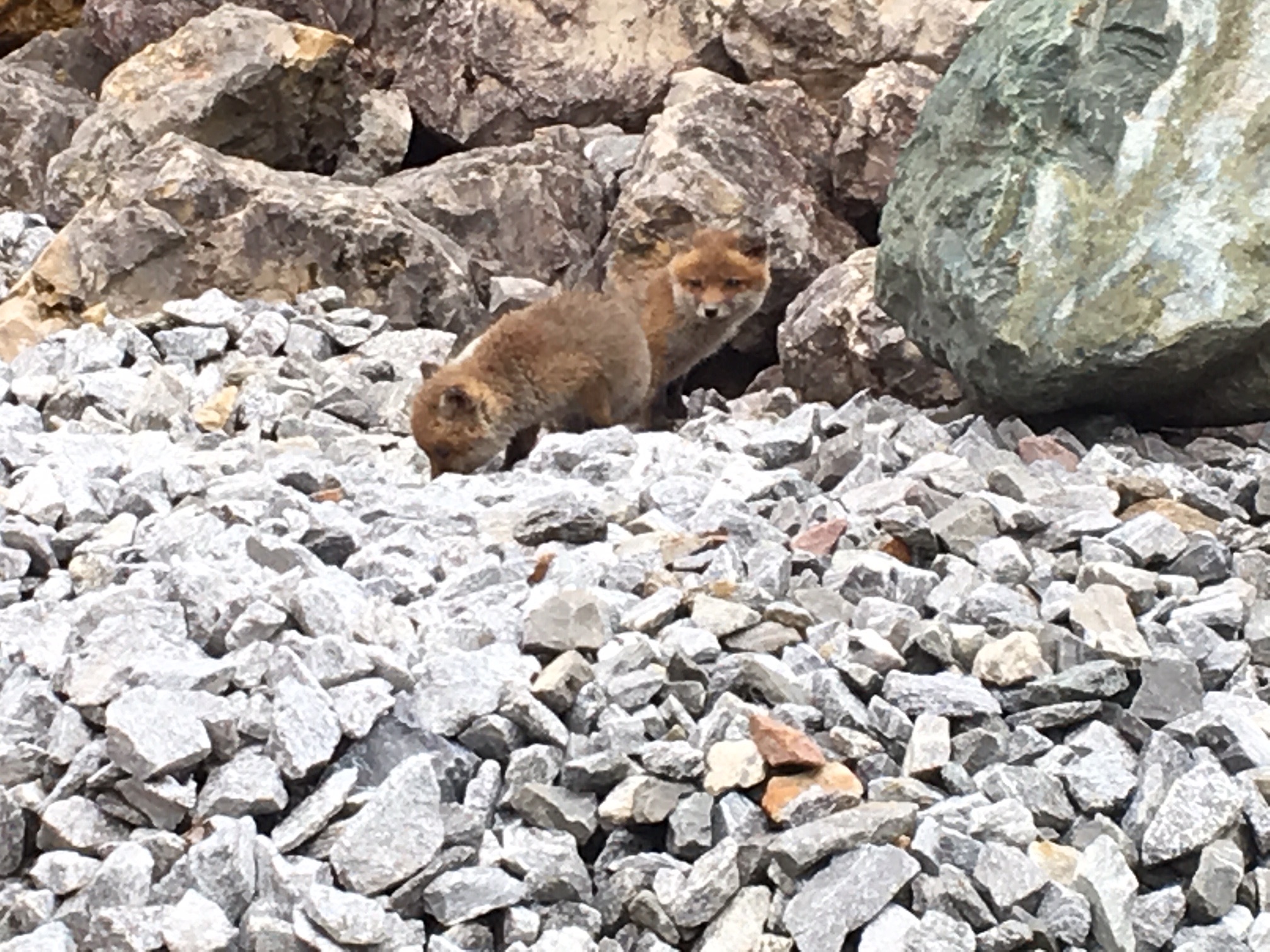 Eine Fuchsmutter hat ihre drei Jungen bei uns zwischen den Felsen abgelegt. Einer der drei Jungen war ein aufgewecktes Kerlchen und sehr mutig, wie die Aufnahmen zeigen. Der zweite traute sich auch ab und zu hinaus und der dritte blieb ziemlich in Deckung.