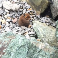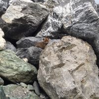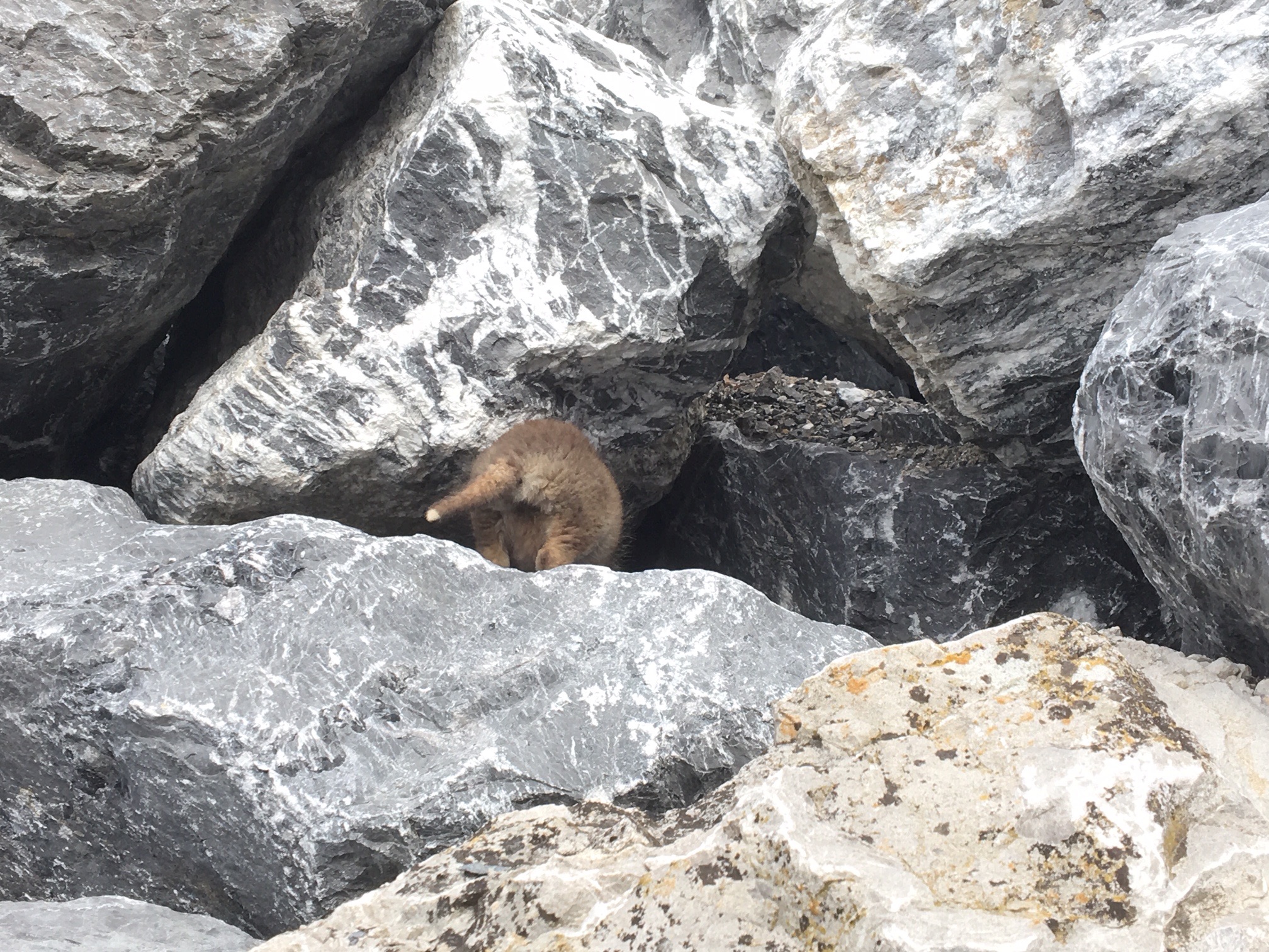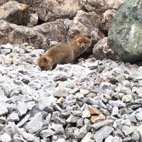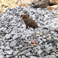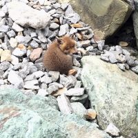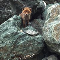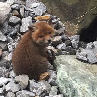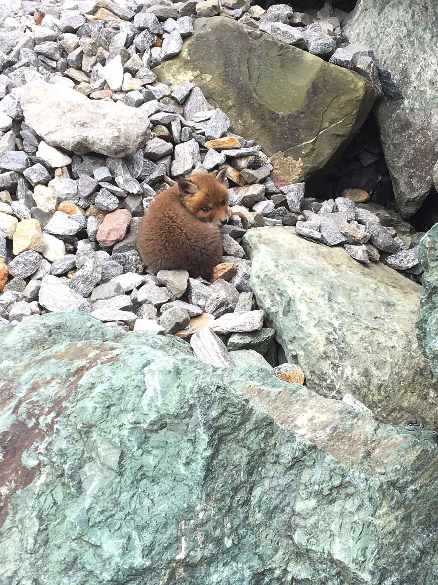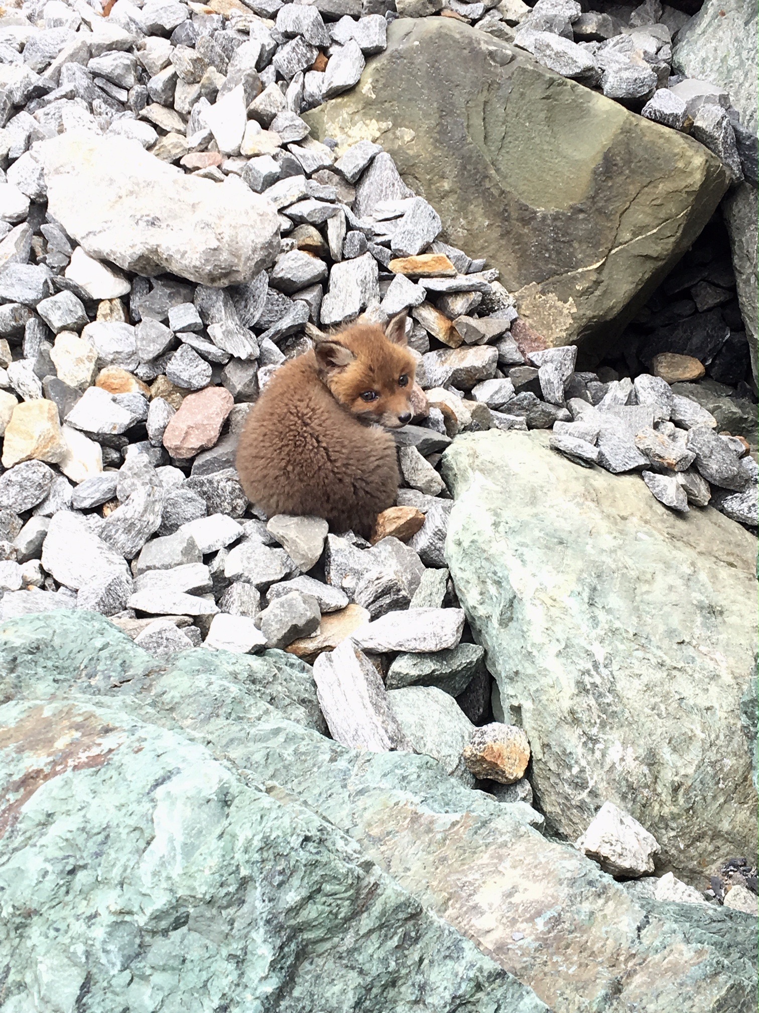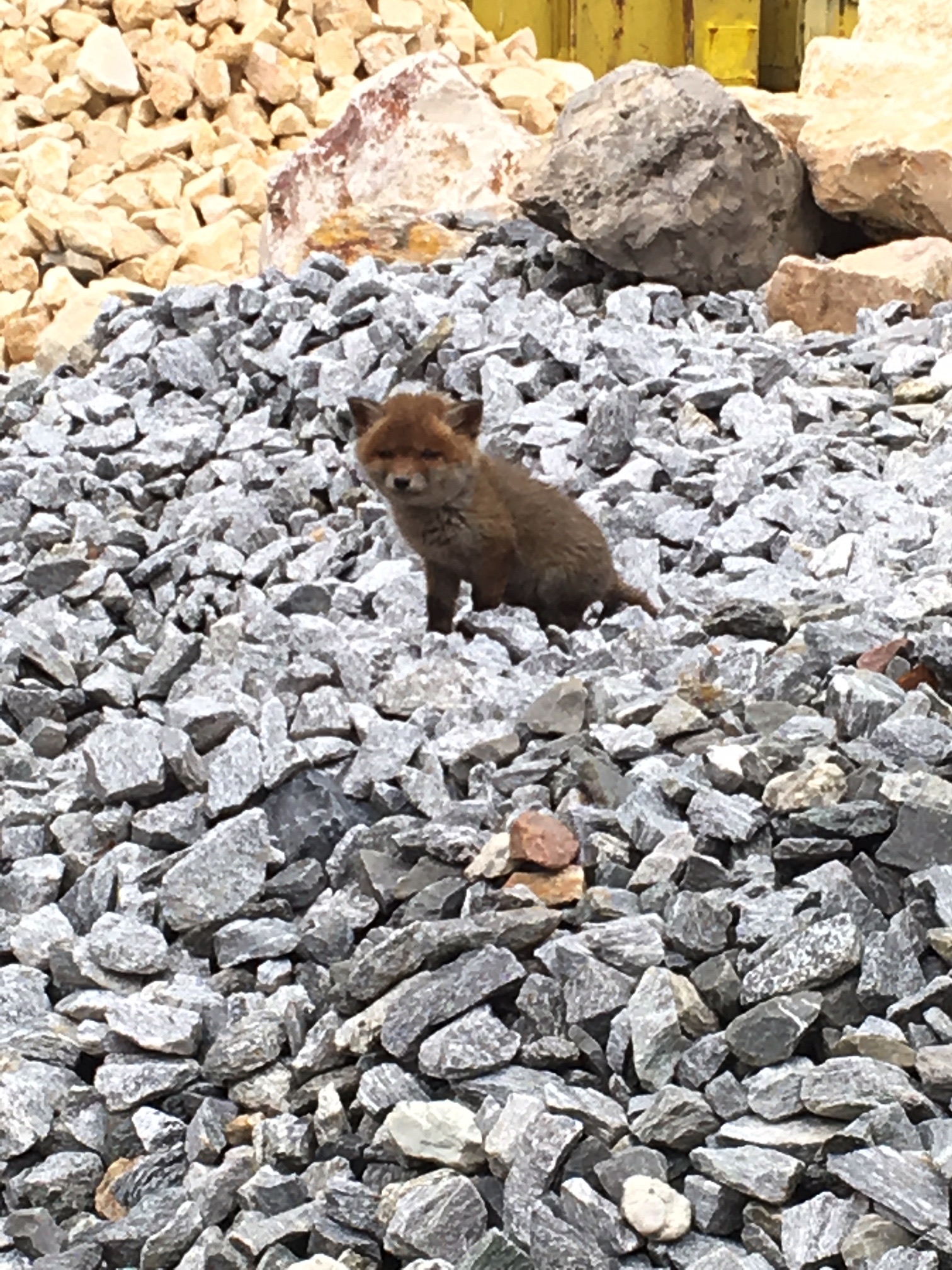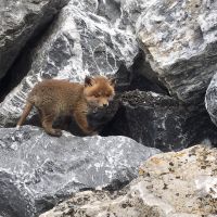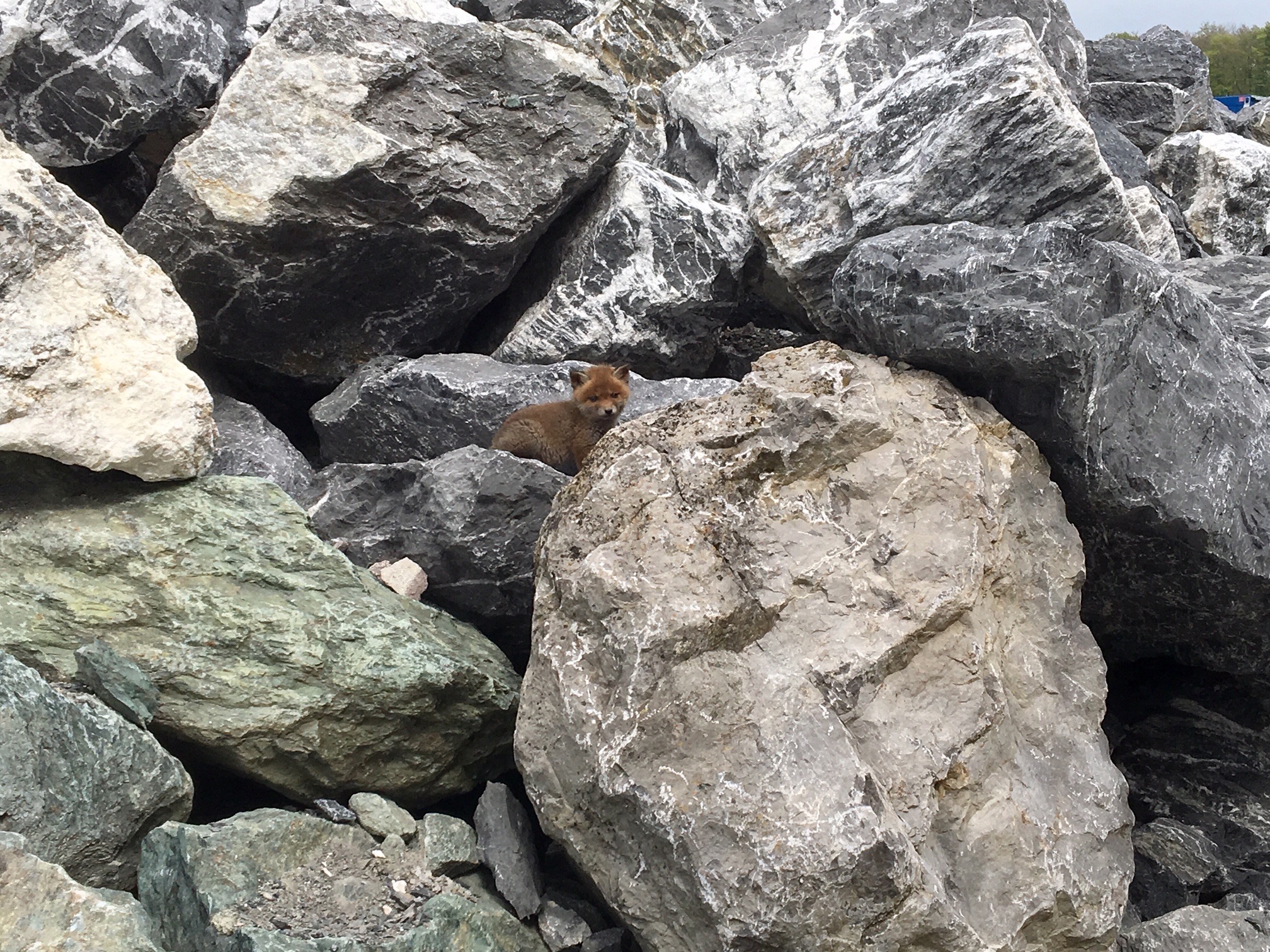 Eine Fuchsmutter hat ihre drei Jungen bei uns zwischen den Felsen abgelegt. Einer der drei Jungen war ein aufgewecktes Kerlchen und sehr mutig, wie die Aufnahmen zeigen. Der zweite traute sich auch ab und zu hinaus und der dritte blieb ziemlich in Deckung.